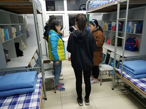 活动开始,外语系学习部成员跟随教师教育学院学习部成员进入各宿舍进行英语背诵检查和口语交流。英语检查的内容主要包括单词和句子,并对学生进行随机抽查近几天的背诵任务,随后进行英语口语交流。在检查过程中,各宿舍成员认真配合,大声朗读并背诵,态度认真。英寝过程中,检查人员认真记录各宿舍检查情况,并将检查结果上交学习部部长。