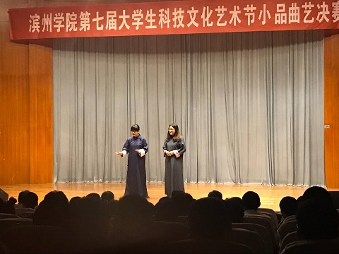 为弘扬曲艺文化,丰富广大同学的课余文化生活,5月18日,外语系在学院会堂参加滨州学院第七届大学生科技文化艺术节小品曲艺决赛,外语系杜晓娜、杨欣悦同学代表参赛。
