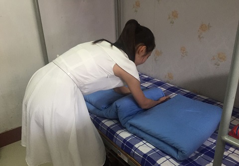 活动伊始,马老师对此次内务整理活动的规则向同学们做了详细的阐释,并宣布活动开始。随后,各宿舍开始了紧张的内务整理,同学们个个忙得不亦乐乎,叠被褥、摆用品、擦窗户、拖地板。选手们采用“三分叠,七分整”的方法,专注的神态,熟练的动作,按时将一床床被子叠成“豆腐块”,多功能架上的洗漱用品整齐有序的呈现出来。活动气氛十分热烈。活动结束后,马老师对各宿舍内务整理情况进行了视察并做了点评,活动在愉快的气氛下顺利结束。