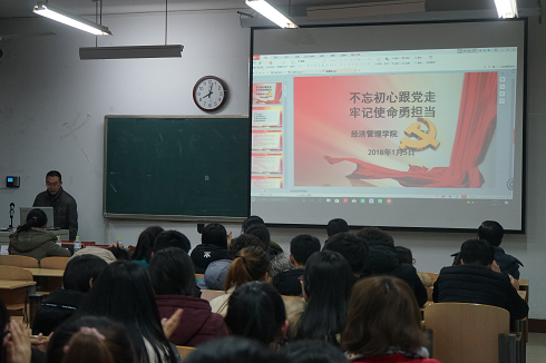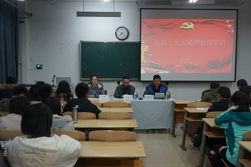 王泰宁老师以“不忘初心跟党走,牢记使命勇担当”为题展开宣讲。首先,他从“七个新”讲解了“十九大概述”;随后,他又讲述了“初心和使命是什么”、“青年人为什么跟党走”、“青年人如何勇担当”等几个方面的内容,最后希望同学们坚定理想信念,志存高远,脚踏实地,勇做时代的弄潮儿。靳雪银老师从什么是党章开始,进一步梳理了党章的发展历程,并重点从“习近平新时代中国特色社会主义思想写入党章”、“根据我国社会主要矛盾作出相应修改”等方面阐述了“十九大党章修改的主要内容”。最后,靳成学副书记做总结发言,希望每位同学认真学习十九大精神并自觉运用到自身的学习、工作和生活中去。