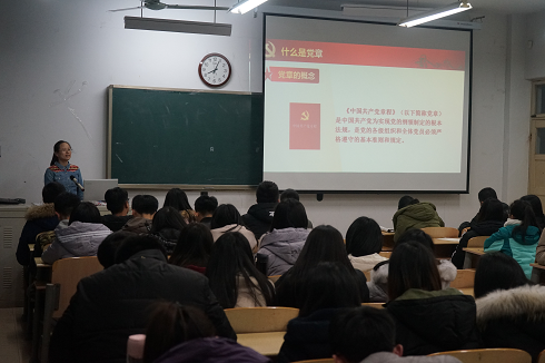 王泰宁老师以“不忘初心跟党走,牢记使命勇担当”为题展开宣讲。首先,他从“七个新”讲解了“十九大概述”;随后,他又讲述了“初心和使命是什么”、“青年人为什么跟党走”、“青年人如何勇担当”等几个方面的内容,最后希望同学们坚定理想信念,志存高远,脚踏实地,勇做时代的弄潮儿。靳雪银老师从什么是党章开始,进一步梳理了党章的发展历程,并重点从“习近平新时代中国特色社会主义思想写入党章”、“根据我国社会主要矛盾作出相应修改”等方面阐述了“十九大党章修改的主要内容”。最后,靳成学副书记做总结发言,希望每位同学认真学习十九大精神并自觉运用到自身的学习、工作和生活中去。