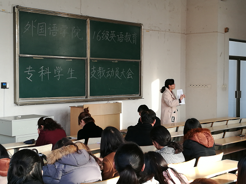 会议伊始,窦副院长开门见山,就支教出发前的准备工作做了详细介绍。其内容主要包括支教地点的地理环境状况、支教主题、支教时间、支教队情况以及支教车队接送等问题。随后,刘雪梅老师介绍了支教所需各种材料等,并要求支教学生书写支教班级活动策划,交流支教老师工作心得,将支教所在地周边教育现状进行调查采访并写出调查报告。刘老师倡导支教学生要记录下自己的支教生活,并将其拍成小视频。紧接着,孟院长就支教的分组情况进行了详细布置并做出重要讲话,她要求,外出支教学生必须注意自身安全,保证自己的每天的学习和工作质量。最后,马盛楠老师就此次大会作了总结,大会圆满结束。