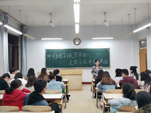 4月13日晚,我院于1号教学楼104教室召开了学生会主要学生干部大会,外国语学院学生科科长苏成荣及学生会副部以上成员参加了此次会议。