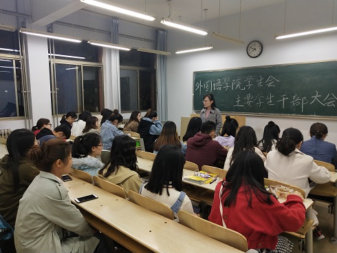 4月13日晚,我院于1号教学楼104教室召开了学生会主要学生干部大会,外国语学院学生科科长苏成荣及学生会副部以上成员参加了此次会议。