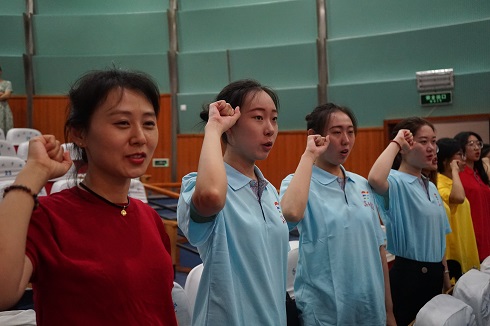 会议伊始,滨州学院团委挂职副书记王泰宁老师宣读了关于做好暑期社会实践的通知,对于项目的准备、实施、结项,以及相关工作要求做了详细部署。接下来是授旗仪式,校领导以及各学院党总支书记分别为各实践团队授旗。各团队代表双手接过的,不止是属于自己团队的旗帜,更是一份沉甸甸的使命、一份厚重的责任。授旗仪式过后,是震撼人心的宣誓环节。在领誓人的带领下,全体志愿者立下勇做担当民族复兴大任的时代新人的铿锵誓言。现场气氛十分高昂。仪式进行第四项,往届社会实践优秀团队分享经验,来自教师教育学院的2018年暑期“三下乡”国家级优秀团队代表做分享报告,详细介绍了团队的志愿服务经历、社会实践经验以及一些关于团队建设和进行实践的建议。仪式第五项,英国365集团公司学生科科长苏成荣老师作为指导教师代表发言,以2018年指导朝阳英语志愿服务队的经验为出发点,她详细的分享了相关指导经验,并代表所有指导教师做出承诺。会议最后一项,党委副书记宋淑平发表讲话,再次强调了暑期社会实践有关注意事项,并着重强调了安全问题。![]()