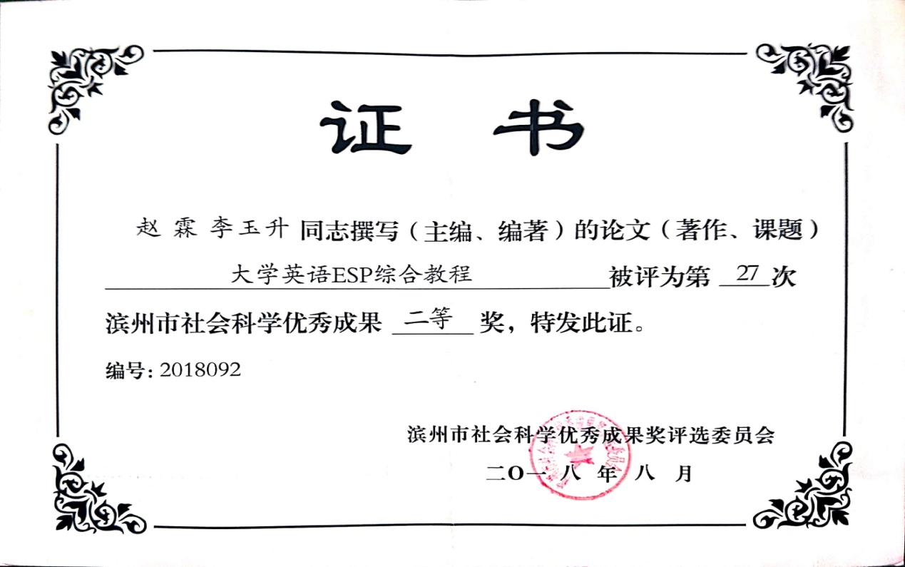 在日前结束的第二十七次滨州市社会科学优秀成果奖评选中,本中心副教授赵霖、李玉升主编的《大学英语