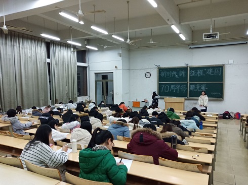 此次活动围绕“不忘初心、牢记使命”主题展开,以笔试的形式进行。试题围绕“中华人民共和国成立70周年我国取得的伟大成就”进行命题。其中“中华人民共和国成立70年,作为新时代大学生,我们应该做什么?”的问题,引导了我院学生树立正确的时代责任感和使命感,激发我院学生为中国特色社会主义事业建设的热情。同学们都认真积极对待此次答题比赛,沉浸于答题之中,现场爱国气息浓厚。监考人员无微不至,严肃认真,维护考场秩序,活动有序进展。