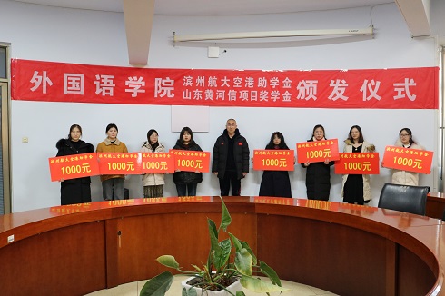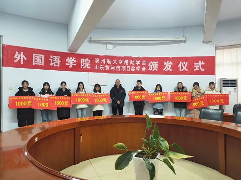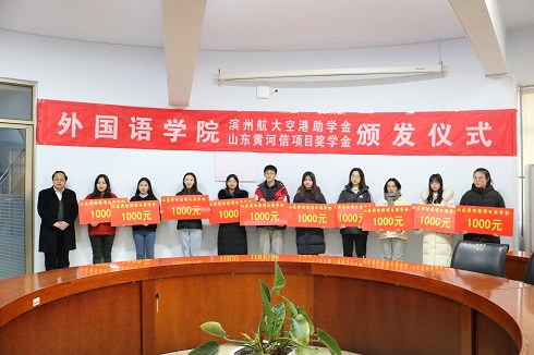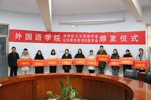 12月30日下午,外国语学院“滨州航大空港助学金、山东黄河信项目奖学金”颁发仪式在201会议室举行。滨州航大空港贸易有限公司总经理刘永、我院党总支书记王保中、副书记靳成学、学生科长苏成荣和学生科全体人员及获奖学生参加了颁发仪式。