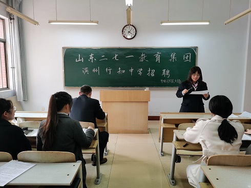 山东二七一教育集团是一家集教育研发、教学管理、培训交流、品牌推广、研学旅行和学生实习农场建设管理于一体的大型公益性教育集团。本次教师招聘活动采取测试、试讲、面试相结合的方式进行。活动伊始,山东二七一教育集团招聘负责人向在场各位表示亲切问候,简单介绍了集团概况,以及此次所需岗位要求,并为有意向的同学下发资料表。随后,应聘学生按照顺序依次上台试讲。同学们仪态大方,精神饱满,声音抑扬顿挫,课堂生动有趣,用自己的方式表现出一位人民教师的风采,给大家留下了深刻印象。面试最后,招聘人员向应聘生提出问题,应聘生作答。评委们根据应聘学生现场表现作出客观公正的评价和打分,面试现场进行得有条不紊、井然有序。