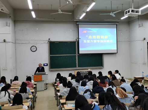 招聘会伊始,大智东营区域人力资源部王寅主管向在场各位表示亲切问候,简单介绍了集团概况,以及此次所需岗位要求,并为有意向的同学下发资料表。王寅主管将大智教育集团简介等情况通过视频方式向大家介绍,让同学们清楚明了的把握现状。随后,大智教育集团执行总裁、首席教学官张朋先生带来的《首席教学官谈就业》,从教学教研的角度,阐释就业的方向和必要性。鼓励同学们把握机会,敢于拼搏。招聘会最后大智东营区域人力资源部孙祎童对此次招聘会总结中表达了对我院学子的祝福与鼓励,激励学子努力学习,为社会服务。