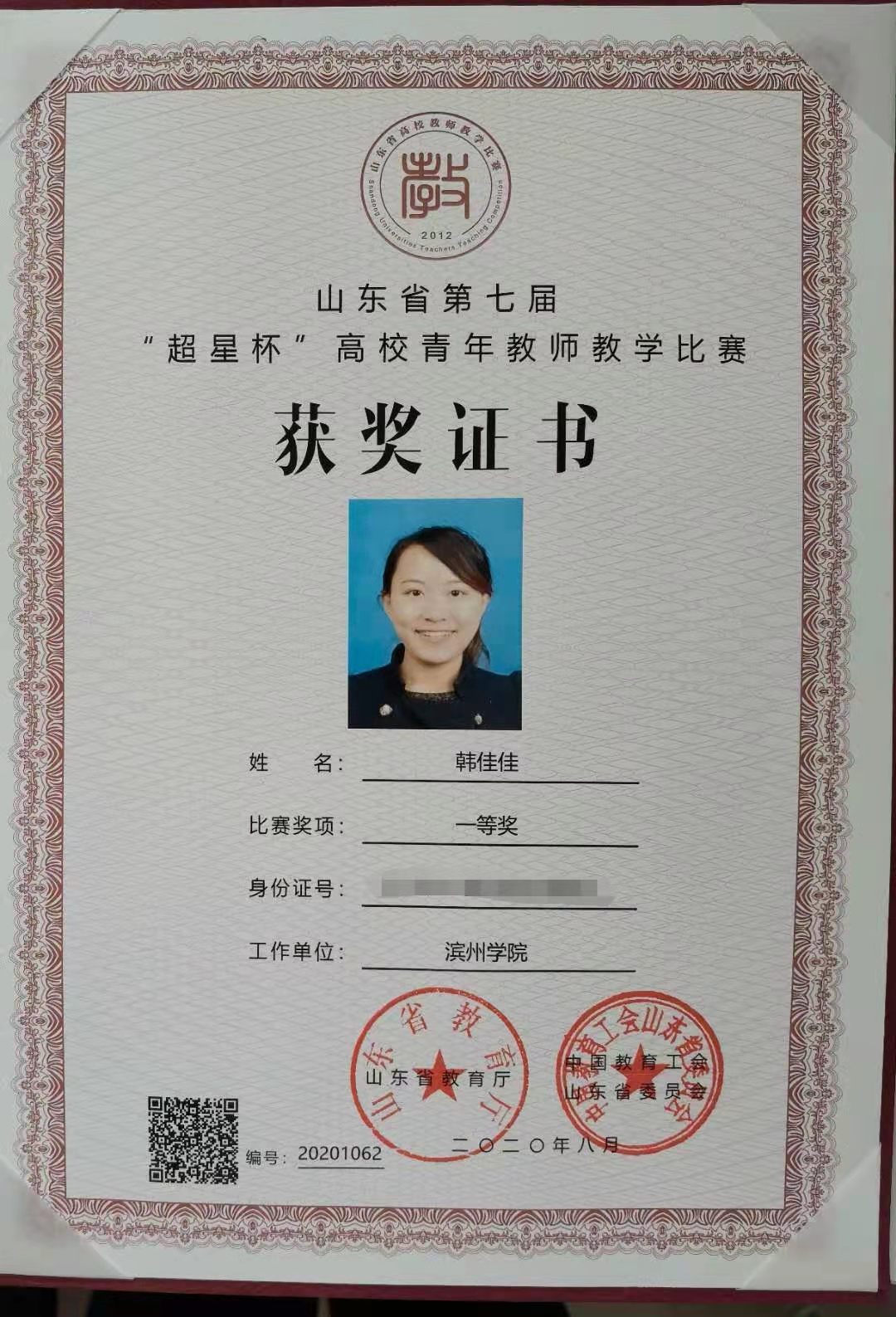韩佳佳讲师获山东省第七届“超星杯”青年教师讲课比赛一等奖