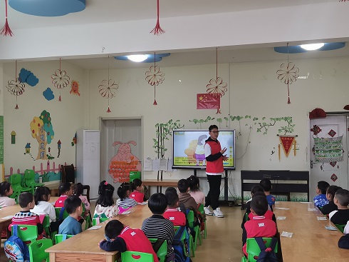 青少年和儿童是祖国的未来,提高他们的普通话水平有利于为其下一步的文化素质的提升打下扎实的语言基础。下午3点,志愿者们来到无棣县海丰街道中心小学。在五年级的班级里,同学们秩序井然,纷纷佩戴上了志愿者们分发的口罩,在志愿者的讲解和与同学们的互动下,小朋友们认识到了普通话的重要性,学习了如何说普通话,在生活中如何运用普通话。然后,志愿者们来到了无棣县海丰街道中心幼儿园,为孩子们讲述了红军长征的红色小故事,将普通话与红色文化相结合,引领孩子们感悟红色文化,让小朋友们明白了幸福生活的来之不易,在潜移默化中影响孩子们。