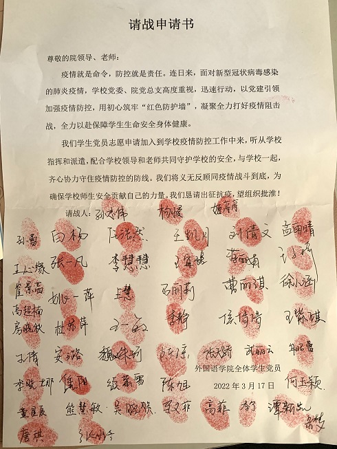 根据防疫工作要求,3月14日开始,我校转为线上上课。英国365集团公司学生党支部在学院党总支的领导下,根据学校工作安排,组建学生党员志愿队学生第七临时党支部。“我们学生党员志愿申请加入到学校疫情防控工作中来,为确保学校师生安全贡献自己的力量。我们恳请出征抗疫,望组织批淮!”铿锵恢宏的誓词,一字一句,神圣而豪迈。党员学生不忘初心使命,积极发挥党员先锋带头作用,主动请缨,在请战申请书上按下手印。