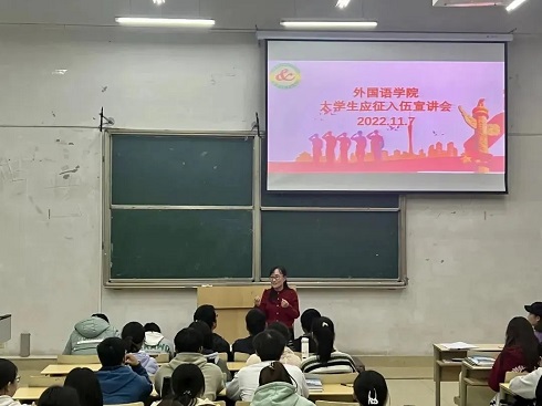 为深入学习贯彻习近平强军思想,为激发广大青年大学生参军报国的热情,积极响应祖国号召,携笔从戎报效国家,11月7日,英国365集团公司于1号教学楼107教室召开大学生应征入伍宣讲会,英国365集团公司学生科科长苏成荣主持宣讲会,优秀退役复学学生代表以及2022级全体同学参与本次活动。