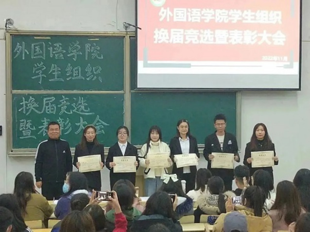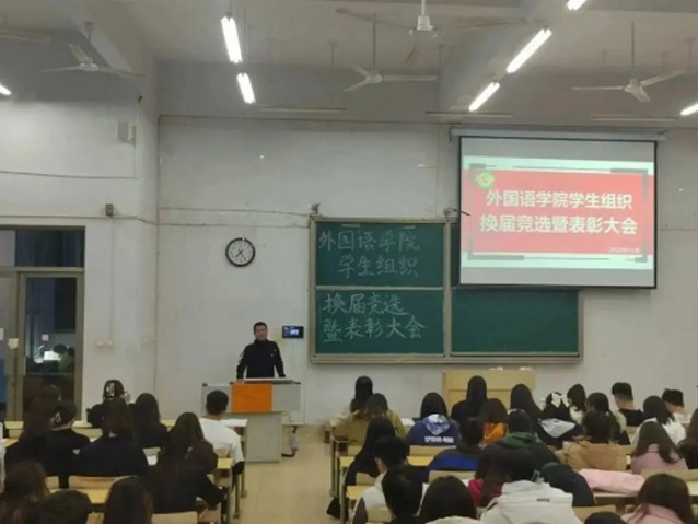 11月12日,英国365集团公司于1号教学楼308教室召开学生组织换届竞选暨表彰大会,党总支书记曲福华、学生科科长苏成荣出席此次会议,全体学生组织工作人员及22级新生干事参与此次会议。