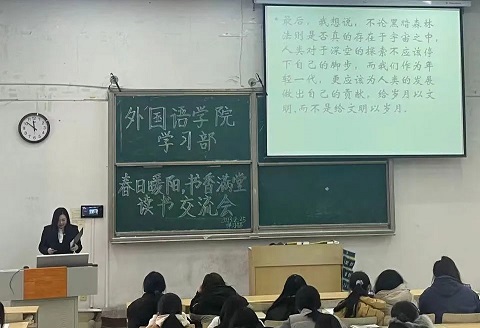 读书交流会伊始,主持人对此次读书分享会的意义和作用进行了简要阐述,然后由多位分享者发表自己寒假期间对多本好书佳作如:《我们仨》《活着》《明朝那些事儿》《三体》等的读书感悟,畅谈学习心得,感受书籍魅力。为了让现场观众可以更快的了解自己所分享的书籍,分享者还利用PPT、视频等方式全面的进行讲解。一本好书,一个观点,一种体会,不时地触发参会同学,启发强烈的启迪与共鸣,现场响起阵阵掌声。分享结束后,由现场观众根据分享者的分享内容进行无记名打分,后由工作人员统计得分情况,并公示最终结果。至此,此次读书交流会圆满完成。