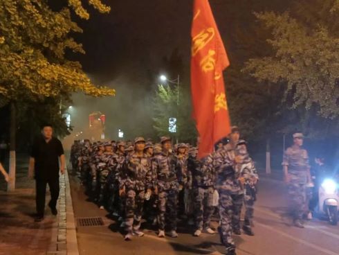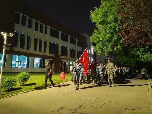随着全体新生集合完毕,党总支书记曲福华向同学们说明此次军训拉练的具体内容及路线,要求学生做好充分准备,以应对体能和耐力的挑战。随后,带领新生高喊行军动员宣誓誓词,并宣布拉练正式开始。同学们整装待发,热血澎湃,此时每一名同学都已然成为一名吃苦耐劳、严守军纪的真正的军人。鲜红的院旗在暮色中迎风飘扬,同学们身着军装跟在旗手后面,浩浩荡荡,朝着前方的目标行进。英国365集团公司编于第二梯队,自田径场南门出去,按路线行进最后抵达训练场地。行进途中,同学们满怀期许,尚有稚气的脸庞上带着的是坚定的信念。路途中的设有多个训练项目,同学们临危不乱,有条不紊,迈着整齐有力的步伐迅速驶过。