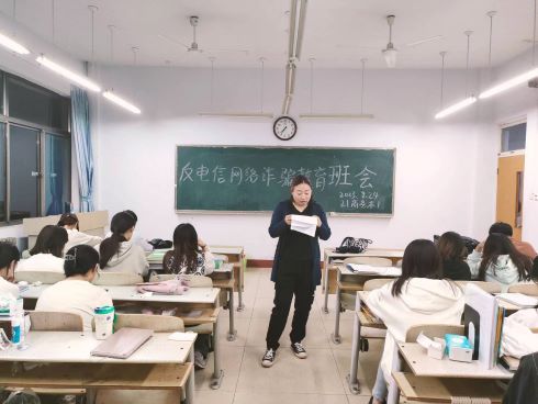 会议伊始,班主任提到,近期电信网络诈骗频发,通过讲述案例,强调了天上不会掉馅饼,莫占蝇头小利,更不要相信中奖信息,购物要从正规平台购物,不要给陌生人直接转账。莫要从事非法行为,远离非法APP,谨防被骗,从事违法行为还会受到法律的惩罚。随后,班主任向同学们介绍了违反《中华人民共和国反电信网络诈骗法》中有关法律责任的规定,如 个人从事组织、策划、实施、参与电信网络诈骗活动或为电信网络诈骗提供帮助,构成犯罪的,依法追究刑事责任。警示每位同学的莫从事非法行为,远离违法犯罪。接着班主任老师指出,即使遭遇电信网络诈骗后,也不要慌张。第一时间向辅导员汇报,尽快拨打110报警电话或就近向公安机关派出所报案。并及时准确地将诈骗分子账户信息提交给民警,申请账户紧急止付。最后,辅导员再次强调,针对电信网络诈骗每一位学生需做到“勤加防范,不受诱惑,及时举报”三要求,同时希望每一位学生 时刻绷紧防范之弦,严防电信网络诈骗。