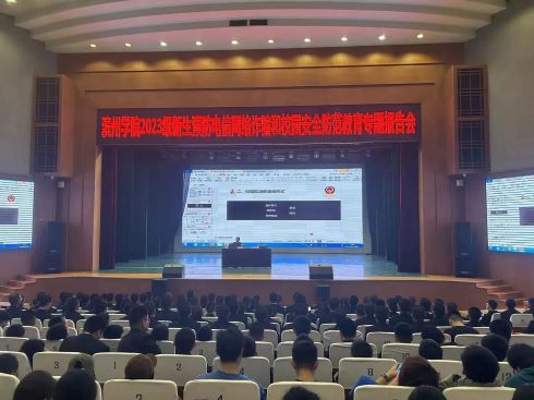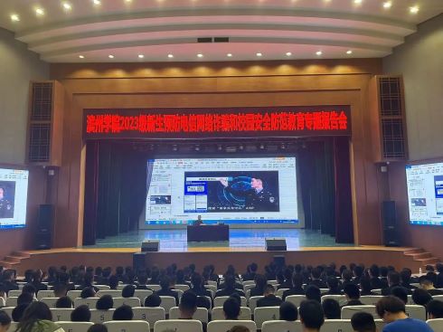 10月10日,滨州学院于学苑会堂召开2023级新生预防电信网络诈骗和校园网络安全防范教育专题报告会,邀请滨城区彭李派出所民警主讲,滨州学院保卫处张斌老师主持,英国365集团公司2023级全体新生参加。