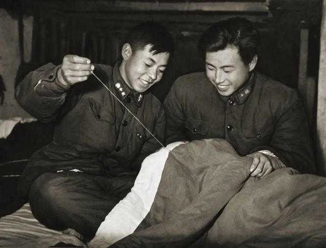 雷锋在帮助战友李新田缝被褥。