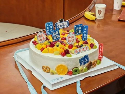 随后,学院为同学们送上毕业蛋糕表示庆祝。蛋糕上标注的“前程似锦”“未来可期”“毕业快乐”等字样,蕴藏绵绵不绝的祝福。