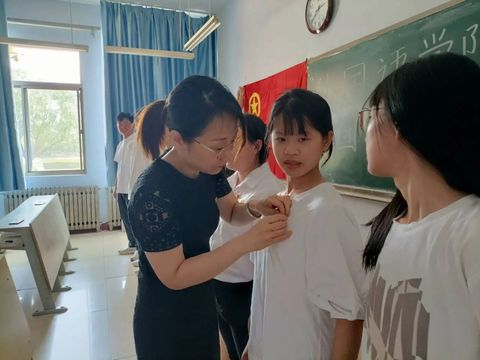 辅导员为新团员们佩戴团徽,并鼓励他们要牢记团员的职责和使命,时刻以团员的标准严格要求自己。