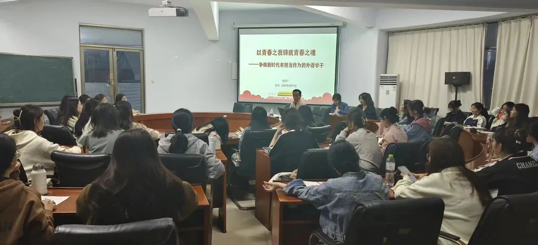 田老师将此次党课分为四个部分:一是习近平总书记关于青年工作的相关论述;二是外语专业学生的使命;三是外语专业学生的责任;四是入党积极分子的担当作为。首先,他提到习近平总书记关于青年工作的六条相关论述,激励全体入党积极分子要更好的服务于祖国。