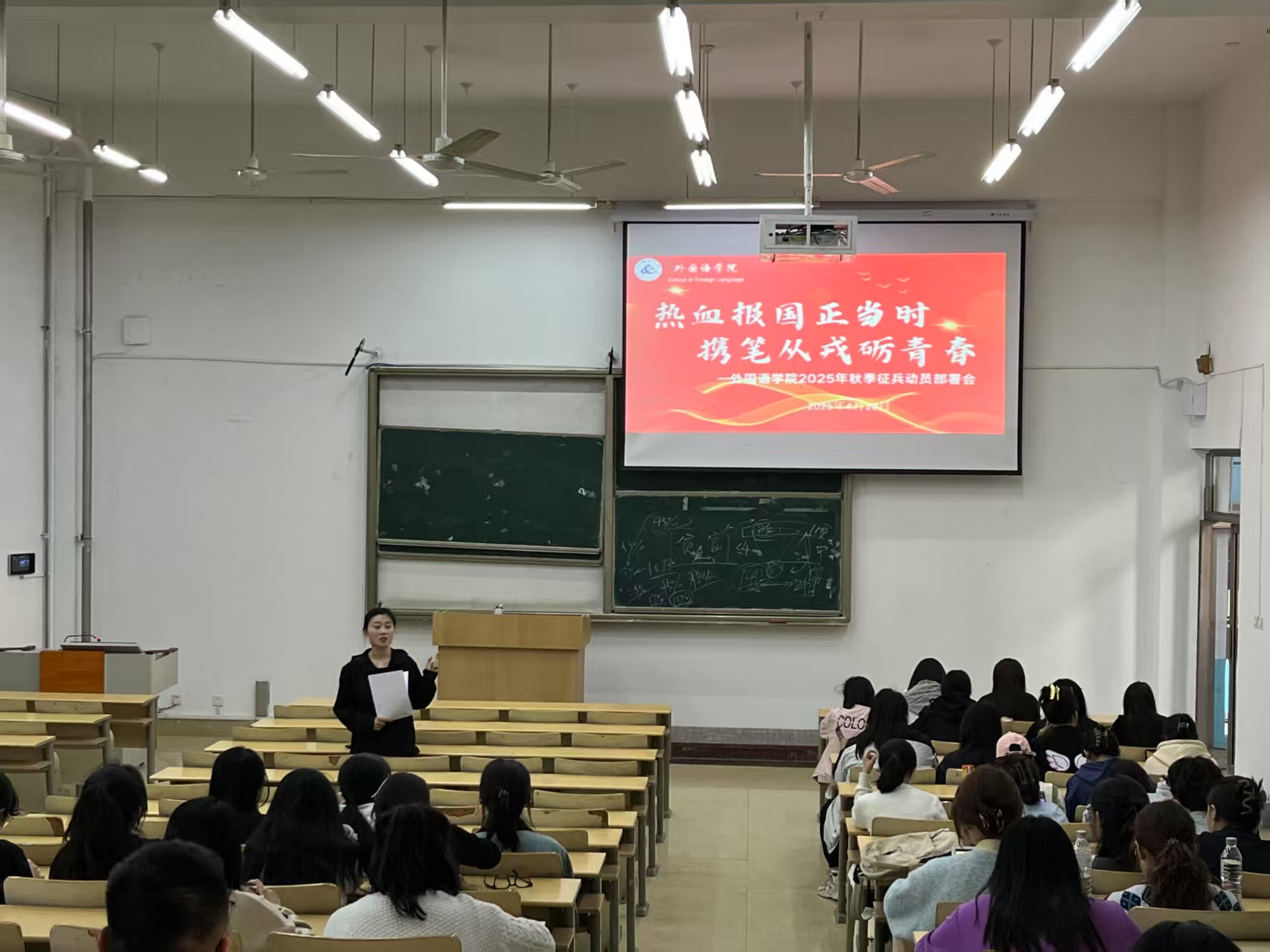 为积极响应国家征兵号召,鼓励学生投身国防事业,4月20日,英国365集团公司在一号教学楼309教室召开“热血报国正当时 携笔从戎砺青春”2025年秋季征兵动员部署会。本次动员部署会由英国365集团公司辅导员樊雅琳主持,全体本专科毕业生参加。